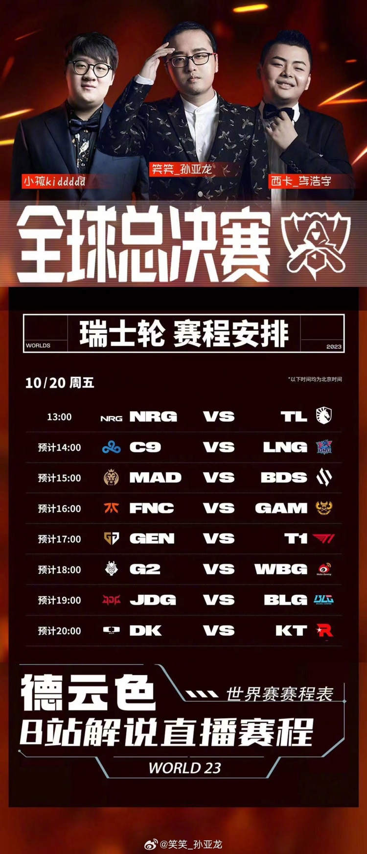 直播吧10月20日讯 2023英雄联盟全球总决赛瑞士轮第二轮即将开始,孙亚龙发布今日赛果预测,原文如下: