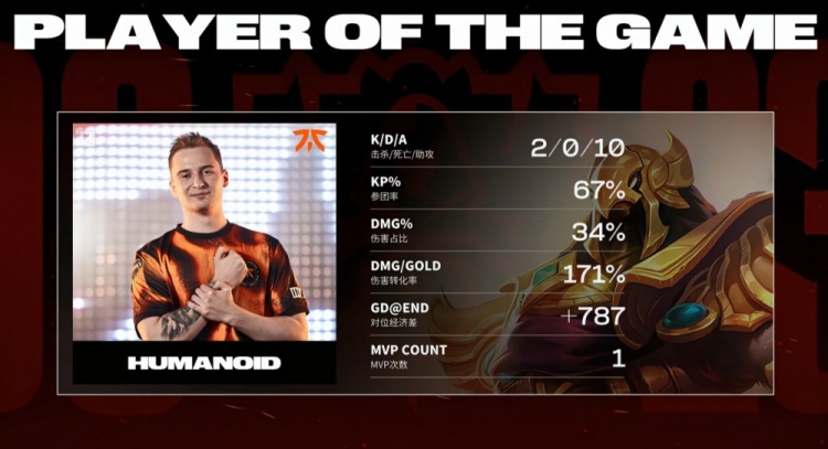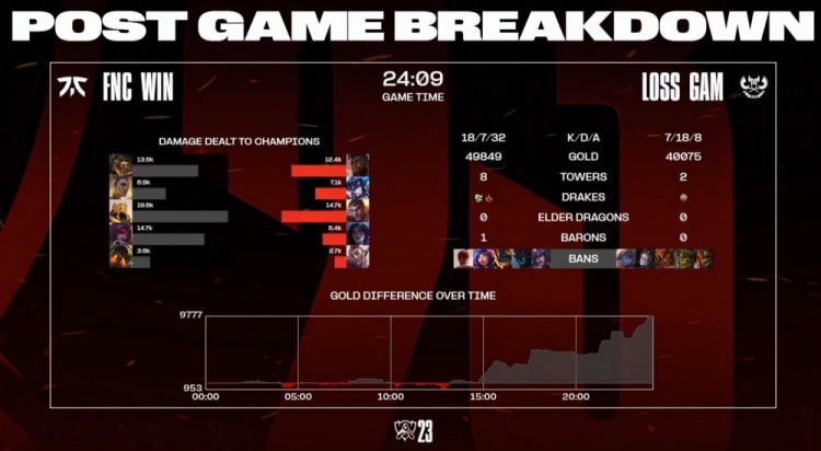 本局前期双方你来我往混战不断,很难预测下一次战斗发生在峡谷何处。Oscarinin在线上惨遭Kiaya单杀。GAM两人眼看FNC收掉小龙,直接选择下路开战,战斗从2v3逐步发展成4V4,FNC整体打出1换4。中期FNC利用二先锋正面推进拔掉GAM二塔,经济优势来到5k。后续Oscarinin大鳄鱼被Kati单杀后,FNC上路开团,Oscarinin鳄鱼复活怒砍三杀找回场子,FNC打出0换4回头收掉大龙,经济优势来到7k。后期GAM中野上路推线阵亡,FNC一波推上GAM高地拆掉基地拿到比赛胜利。