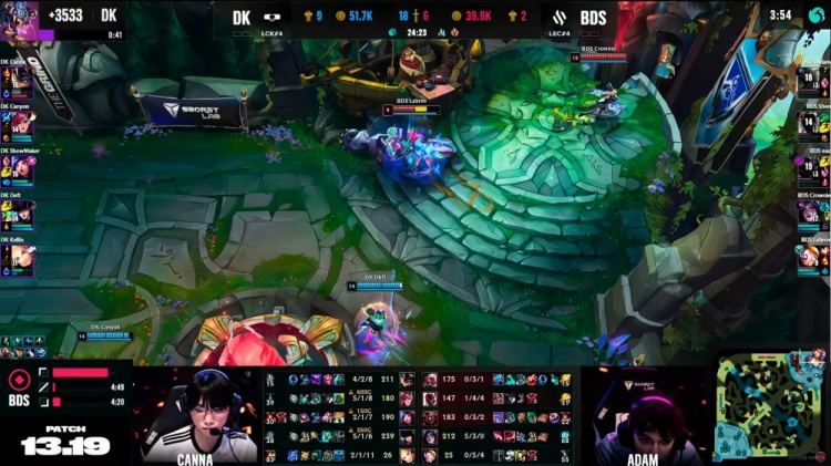 【18:42】BDS三人草丛埋伏再次强杀Canna兰博,但是ShowMaker妮蔻TP绕后直接大了四个!这波DK打出1换3,再推掉BDS的最后一座外塔!