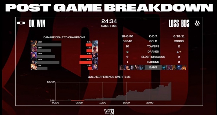 首局DK选出女警拉克丝下路打出压制,上路Adam狗熊想单杀但是缺个点燃被Canna兰博丝血反杀!中期BDS想在资源上做文章,但是被ShowMaker妮蔻几个大招和Canna兰博地暖直接打炸了!虽然Crownie卡莎先后拿下两个终结赏金,但是大龙团DK随便钓鱼各个击破收下大龙之后BDS再无翻盘可能,DK运营压制成功赢下首局!