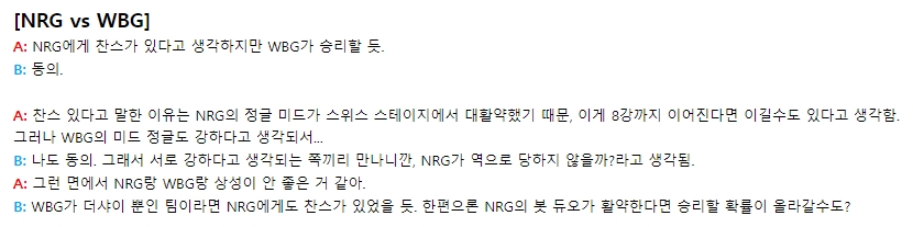 B:如果说WBG是只靠TheShy的队伍,那么NRG会有机会。从另一个方面来看,如果NRG下路组发挥非常出色,那么取胜几率会变高。