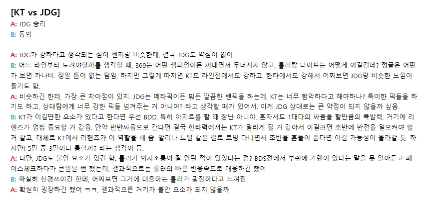 B:如果思考要攻略哪个位置,369无论选什么英雄都不会崩,该怎么赢Ruler和knight呀?打野还是Kanavi。真的是没有弱点的队伍。但是这样看的话,KT的对线也很强、打团也很强,和JDG是差不多的感觉;