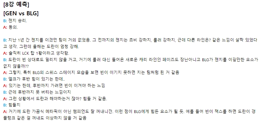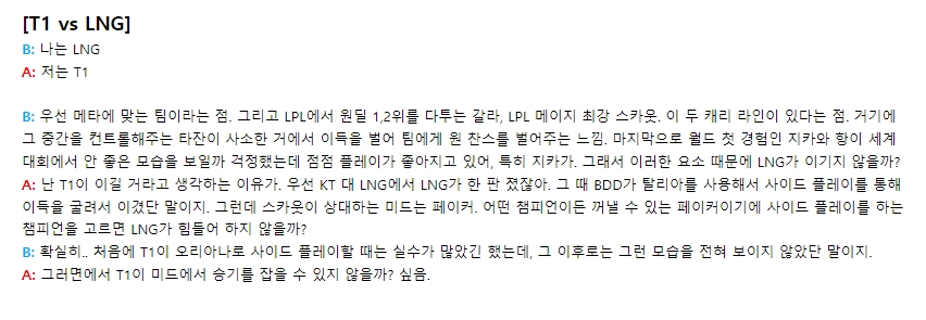 B:首先,LNG是很适合这个版本的队伍,而且他们拥有在LPL数一数二的AD GALA,LPL AP英雄最强者Scout这两个carry位。在这之间进行调解的Tarzan选手会从琐碎的细节中获利,帮助队伍找到机会。本来我很担心第一次参加全球总决赛的Zika和Hang会表现不佳,但感觉他们的表现越来越好了,特别是Zika,所以综合这些要素,LNG应该会赢。