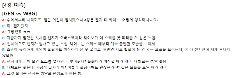 A:先看上半区,因为我们对上半区八强的意见一致,这里就是GEN vs WBG。你怎么看呢?