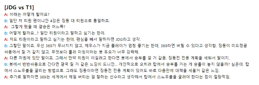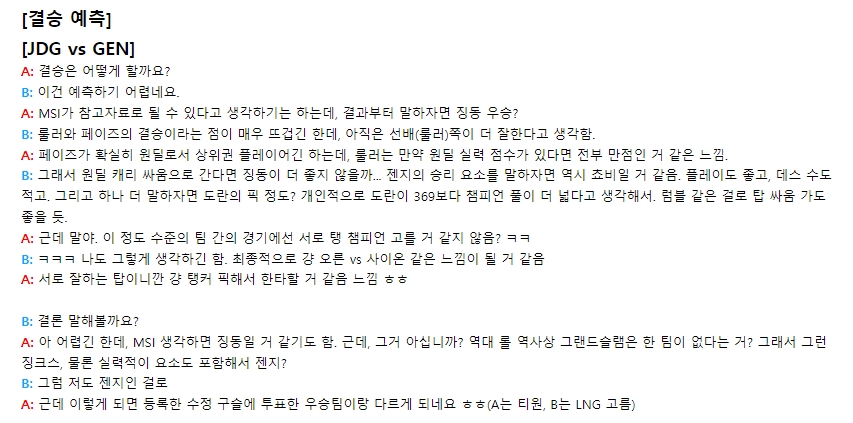 B:因为我是T1粉丝,半决赛就统一成JDG打T1吧。(PS:这位预测T1打LNG,LNG取胜)