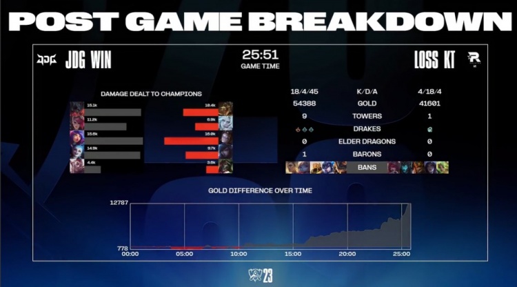第二局前期小龙与下路团战,knight妮蔻强势留人帮助JDG打开局面,随后先锋团又是knight妮蔻侧面进场大到KT四人,JDG打出2换5团灭KT经济领先3K。中期小龙团Missing洛W抬起KT三人,KT毫无还手之力被JDG打出0换4,JDG大小龙通吃经济优势瞬间来到8K。最终JDG中路一波推上KT高地,Ruler金克丝三杀收尾,JDG推平KT基地扳回一局。