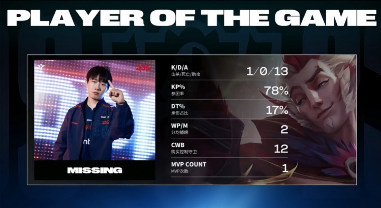 蓝色方JDG:369剑魔、Kanavi蔚、knight妮蔻、Ruler金克丝、Missing洛