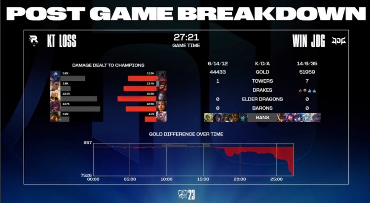 第三局前期KT三人包上越塔强杀369得手,但369随后单杀Kiin找回场子。中期河道团战Kanavi猴子与Missing洛一起进场搅翻KT阵型,Ruler双杀到手,后续小龙团JDG如法炮制,Ruler斩获三杀,JDG收掉风龙魂。后期Kiin上路被抓,JDG中路推进团灭KT,knight三杀收尾,JDG推平KT基地拿到赛点。