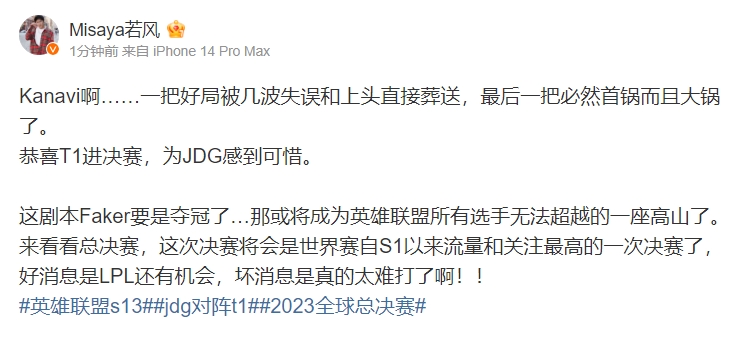 直播吧11月12日讯 在今日的S13全球总决赛半决赛上,T1击败JDG成功晋级决赛,赛后若风更博。