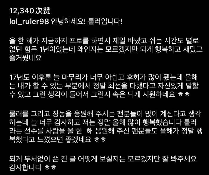 我想有很多为Ruler和京东这个队伍应援的人,一直都很感谢,我今年真的很幸福。希望所有为Ruler选手应援的人们也能觉得今年很幸福就好了。