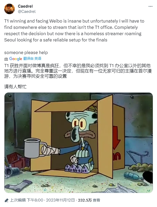 直播吧11月14日讯 近日LEC解说、TheShy铁粉——欧刚Caedrel更新推特,表示自己因为支持WBG夺冠,被T1的工作人员赶出了办公室,因此目前正在韩国流浪没法直播,求网友收留。