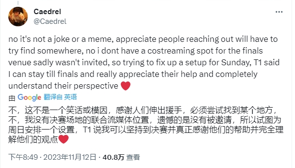 但不少网友不相信Caedrel的言论,怀疑他是在整活。结果Caedrel再次发文表示:这不是一个笑话或者梗,因为自己没有被拳头官方邀请到二路,所以自己必须在决赛前找个地方直播,T1官方说可以收留自己到决赛前,自己完全理解他们的立场。