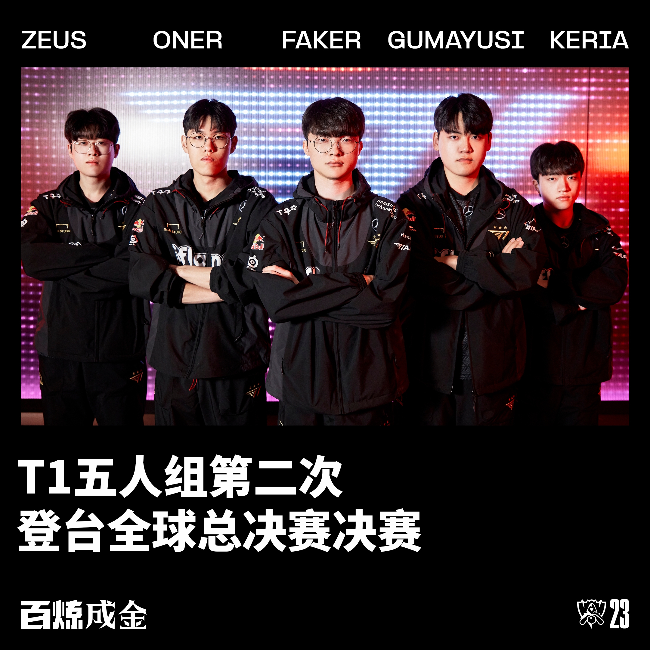 直播吧11月19日讯 英雄联盟2023全球总决赛决赛WBG对阵T1,Zeus、Oner、Faker、Gumayusi、Keria五人组晋级2022年与2023年全球总决赛决赛,是历史第二个二次登台全球总决赛决赛舞台的五人组。