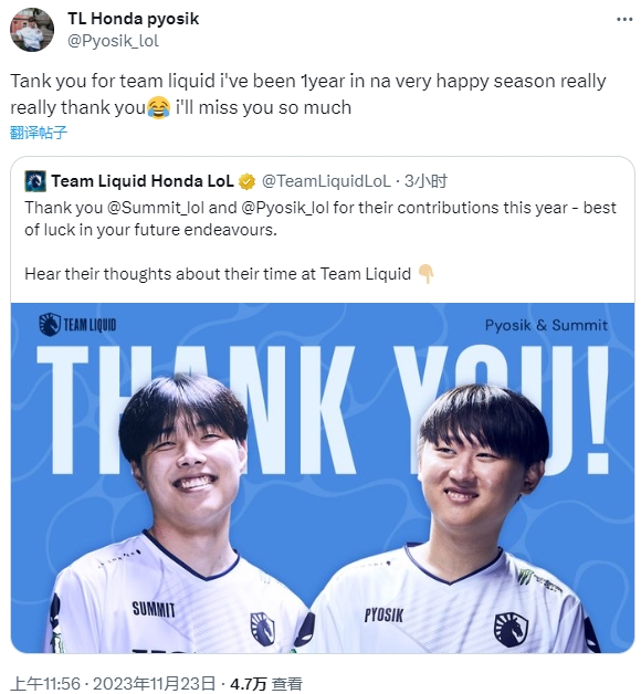 >pyosik更新推特告别TL:我在NA度过了非常开心的一年,我会想你们的