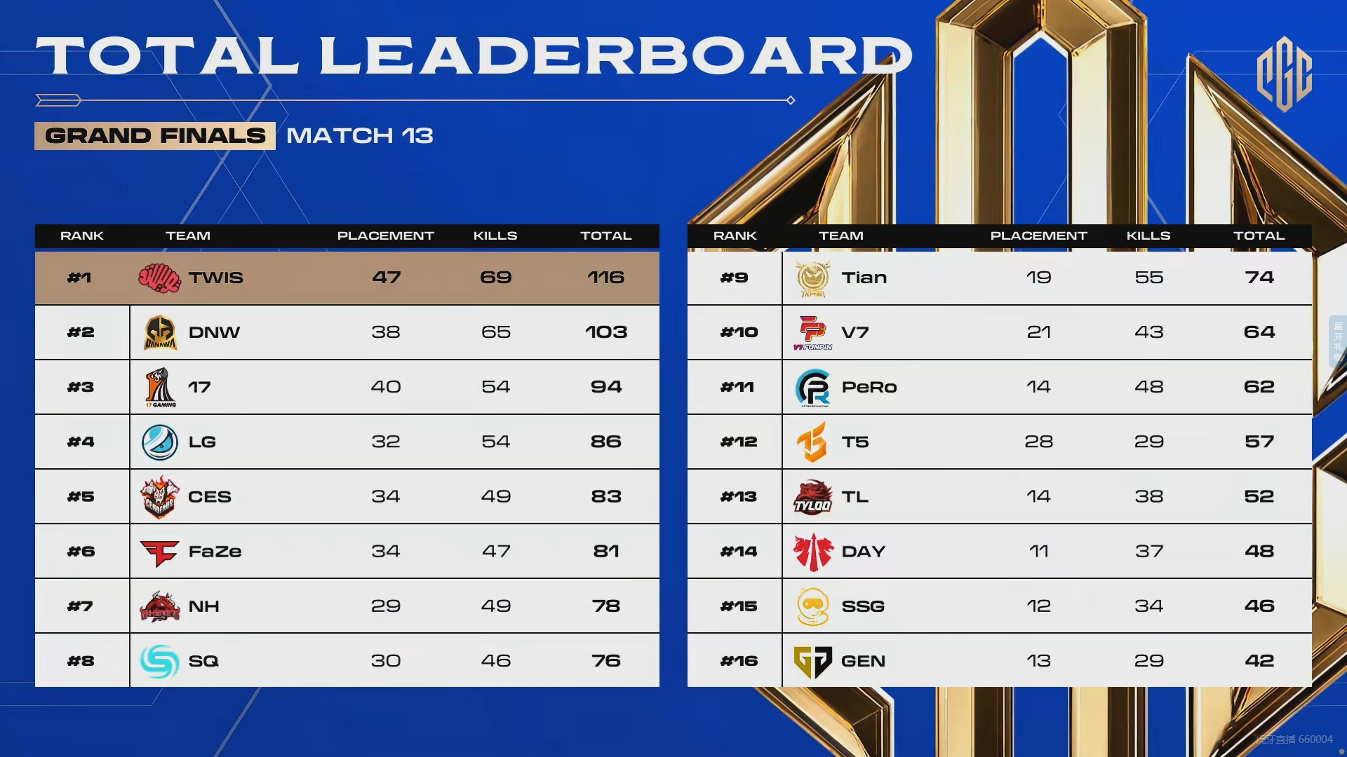 决赛圈剩下TWIS、SQ、GEN、T5四队,结果四队两两互爆,TWIS直接淘汰T5、GEN两队拿下今日首局上大分。