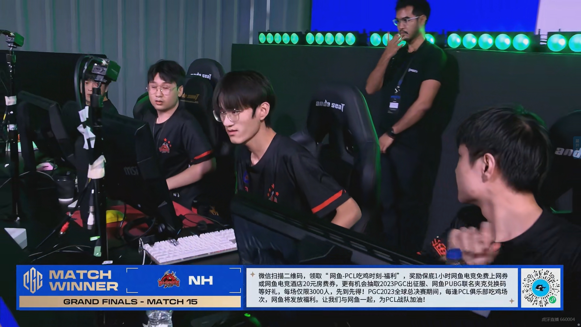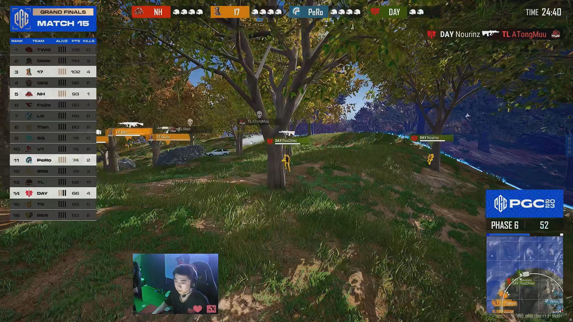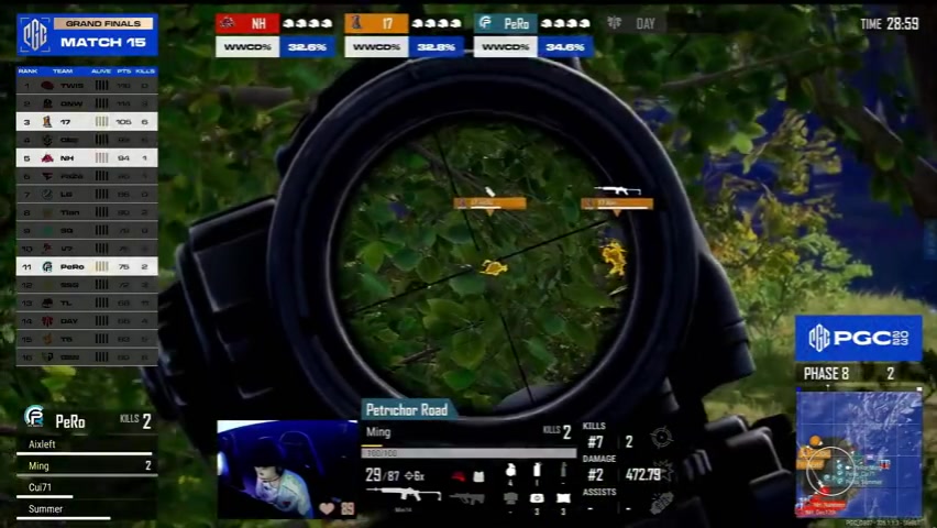 决赛圈剩下NH、17、PeRo、DAY四队,17.Sujiu一雷双响轻松淘汰DAY两人。剩下三支中国队内战,三队互相架枪对射,小鬼、Ming被NH打倒补掉,17转移率先出局。NH正面无敌轻松淘汰PeRo拿下中国队今日第一鸡。