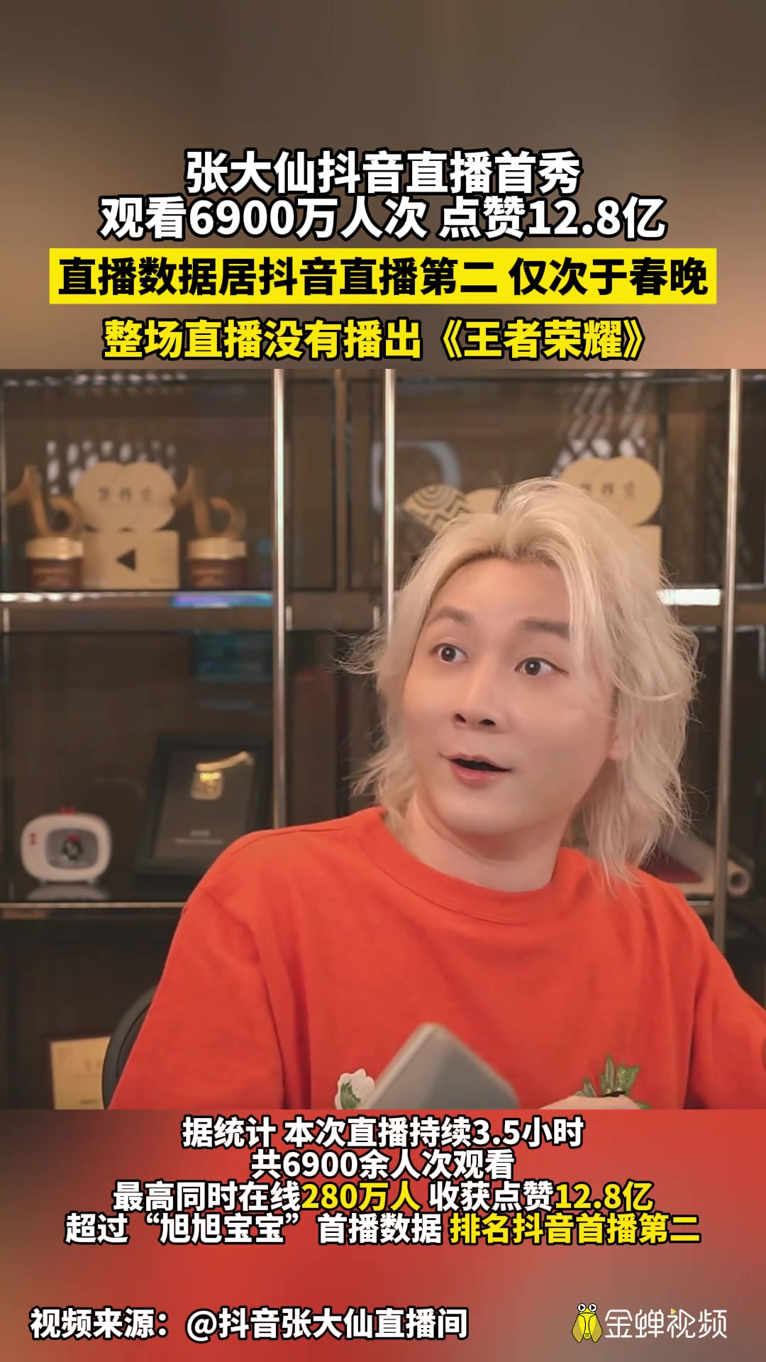 12月2日晚,张大仙开启抖音的首场直播,其号召力依然处于顶流:观看人次超过6000万,最高在线人数超过200万,点赞数超过12亿。