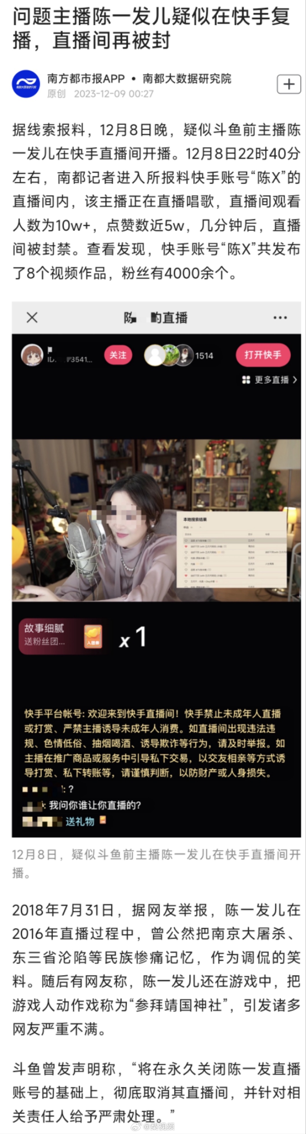 12月8日晚,疑似斗鱼前主播“陈一发儿”在快手直播间开播。据南都报道,22时40分左右,当时直播间观看人数为10w+,点赞数近5w。几分钟后,直播间被封禁。