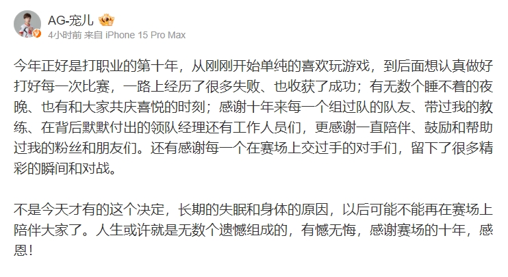今年正好是打职业的第十年,从刚刚开始单纯的喜欢玩游戏,到后面想认真做好打好每一次比赛,一路上经历了很多失败、也收获了成功;有无数个睡不着的夜晚、也有和大家共庆喜悦的时刻;感谢十年来每一个组过队的队友、带过我的教练、在背后默默付出的领队经理还有工作人员们,更感谢一直陪伴、鼓励和帮助过我的粉丝和朋友们。还有感谢每一个在赛场上交过手的对手们,留下了很多精彩的瞬间和对战。