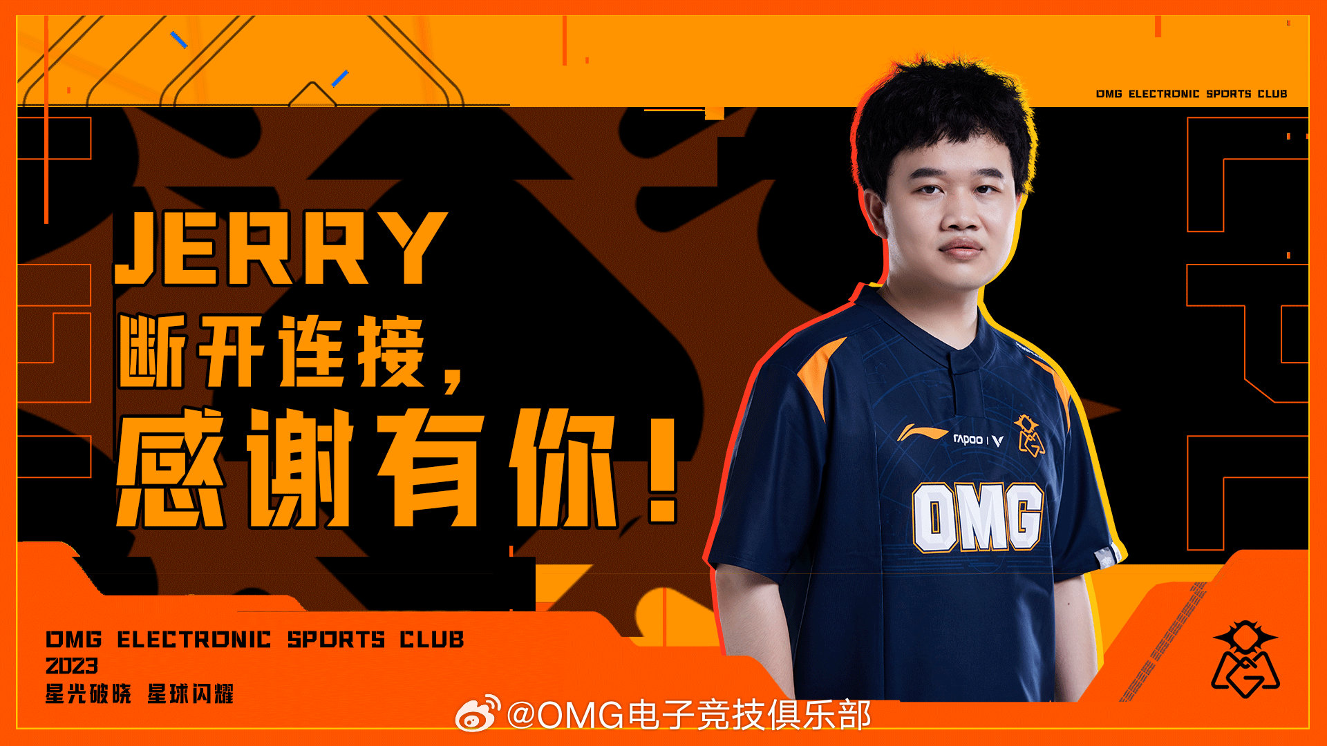 原OMG电子竞技俱乐部英雄联盟一队选手:OMG.Jerry(周克学)即日起以自由人身份离队。