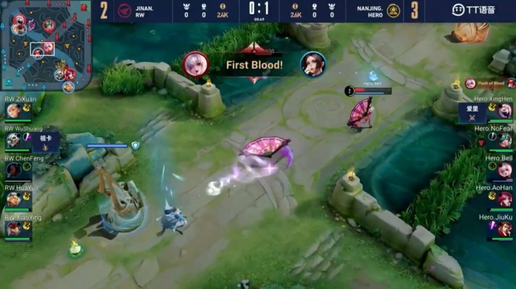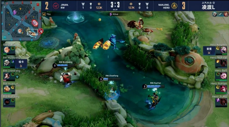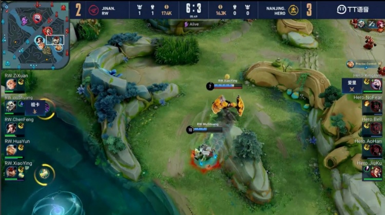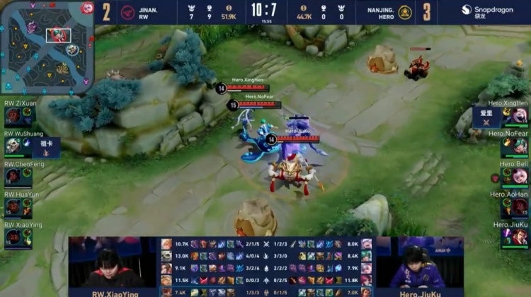 【6:49】济南RW上路推进拔掉南京HERO二塔,爱里惨遭集火被带走。随后小乔在自家野区被抓,济南RW经济优势来到4k。