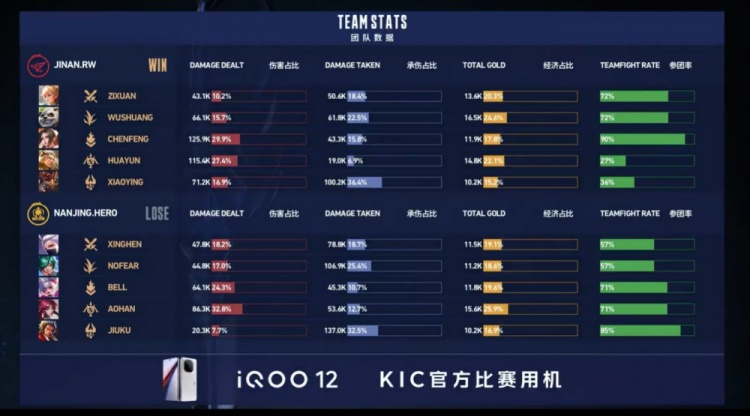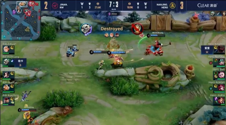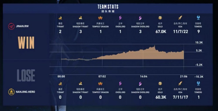 【15:09】济南RW强行拆掉南京HERO上路高地塔,经济领先来到1w。随后济南RW直接冲上南京HERO高地但被南京HERO打出1换4,祖卡顺利撤退,南京HERO拔掉济南RW中路一塔。