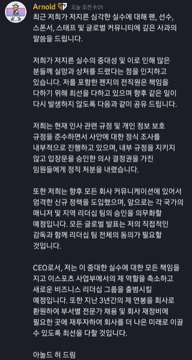 对于我们最近犯下的严重失误,我向粉丝、选手、赞助商、工作人员和全球论坛表示深深的歉意。
