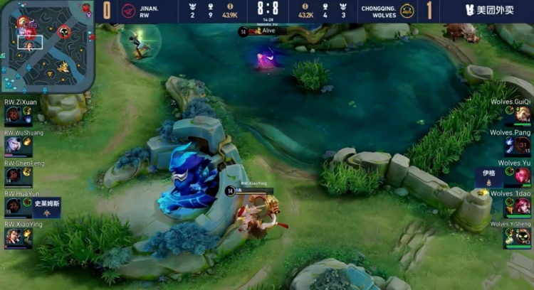 【20:57】河道开团,史莱姆斯先带走伊格,宫本武藏跟着倒下,伽罗也没能活命,济南RW打出1换5团灭重庆狼队,拆掉基地扳回一城。