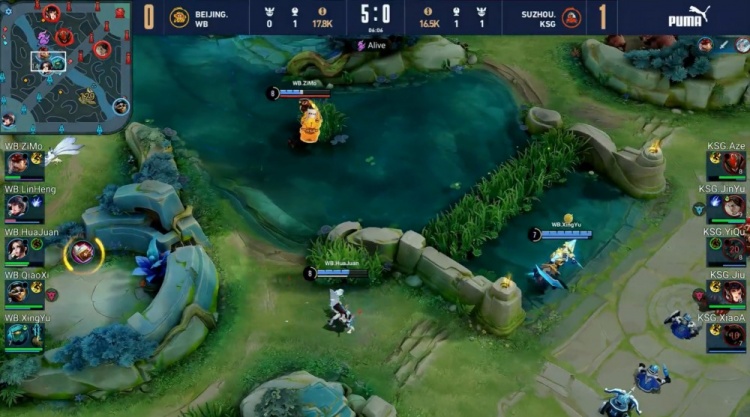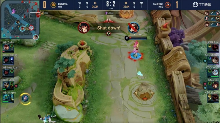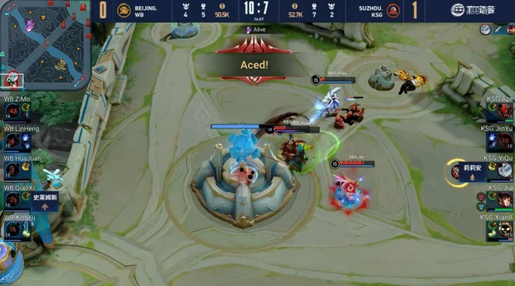 【16:13】中路开团,小玖孙尚香坐地输出,娜可露露先被带走,史莱姆斯疯狂输出复活甲起身又被击杀,苏州KSG打出1换5团灭北京WB,顺势一波推平基地再下一城。