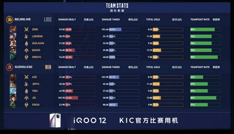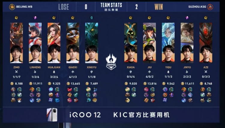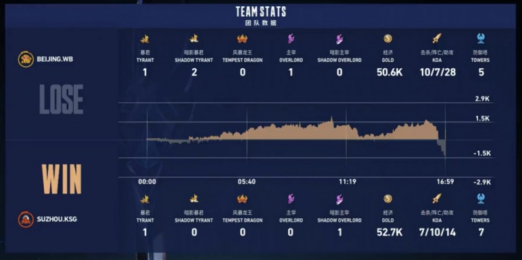 第二局前期北京WB在中上两路打开局面,中上野不断带起节奏,梓墨廉颇更是一马当先主动开团,但双方经济差距仅有2k。后期苏州KSG利用啊泽白起技能全在主动接团,小玖孙尚香疯狂输出,苏州KSG强势一波团灭北京WB后,推平基地再下一城。