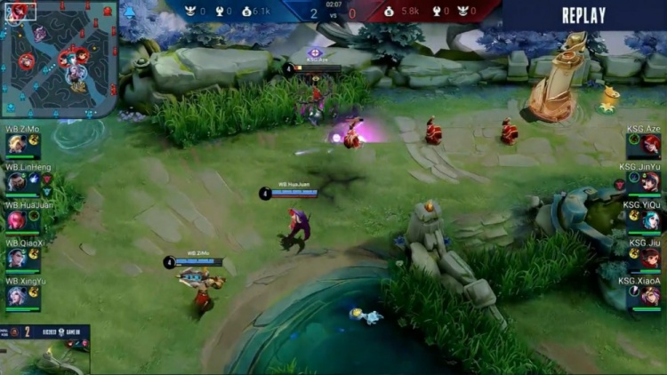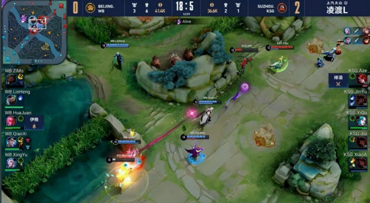 【12:39】苏州KSG来河道抓到梓墨狂铁,啊泽想要留人,狄仁杰在明世隐的力保下抗住了所有伤害,北京WB打出1换3,推掉苏州KSG中上高地,高地开团狄仁杰无人可挡,北京WB推平苏州KSG基地扳回一城。