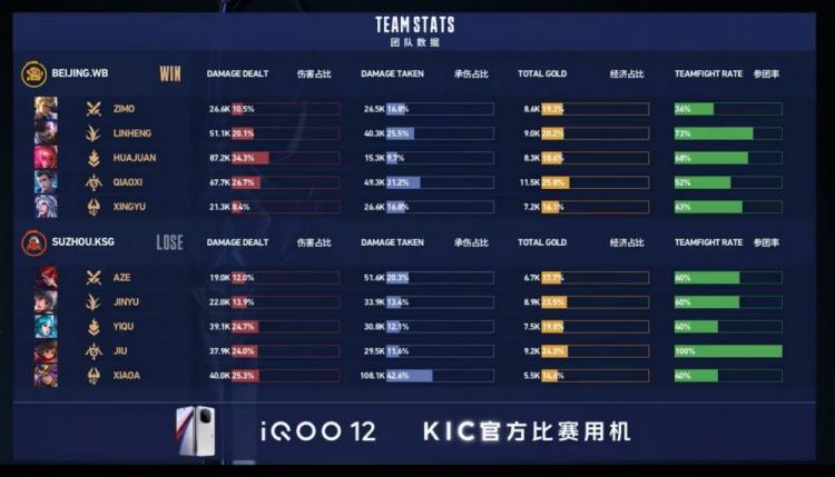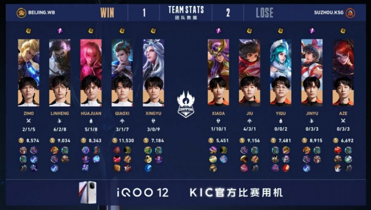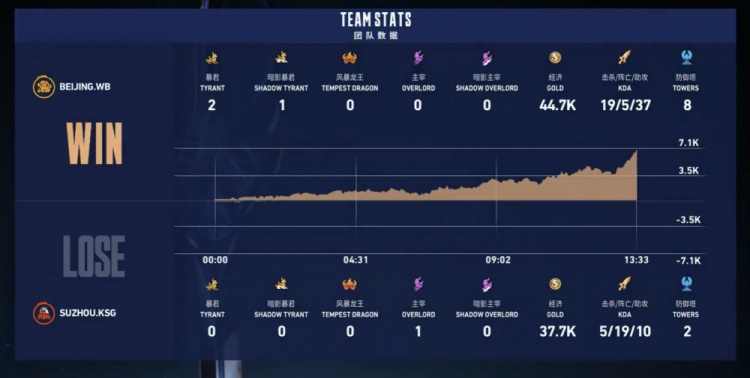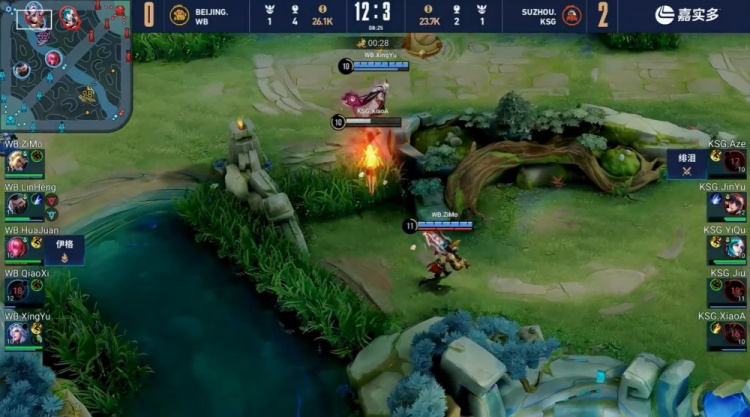 【11:44】北京WB中路发难,狄仁杰与明世隐完美配合击杀今屿与小A,随后北京WB推掉苏州KSG二塔,经济领先4k。
