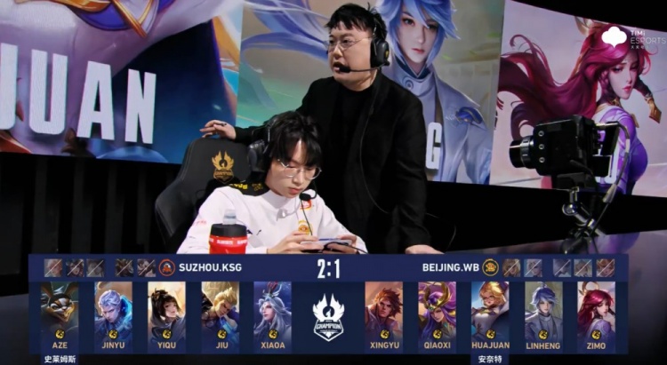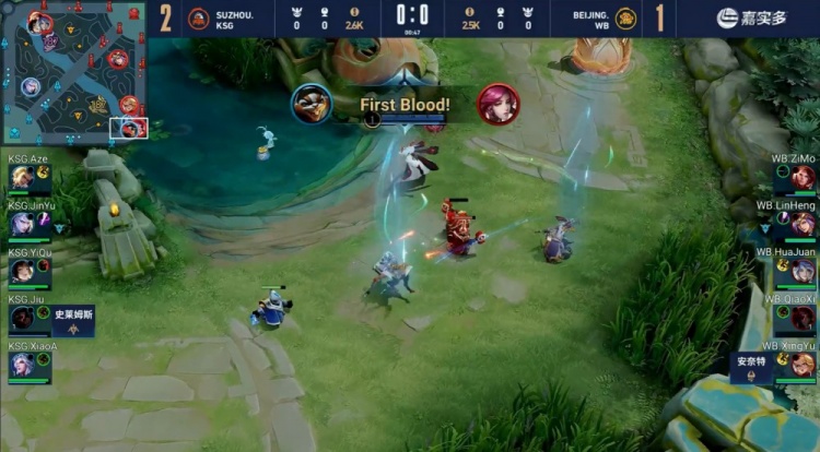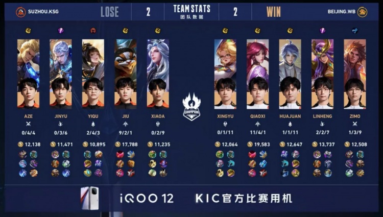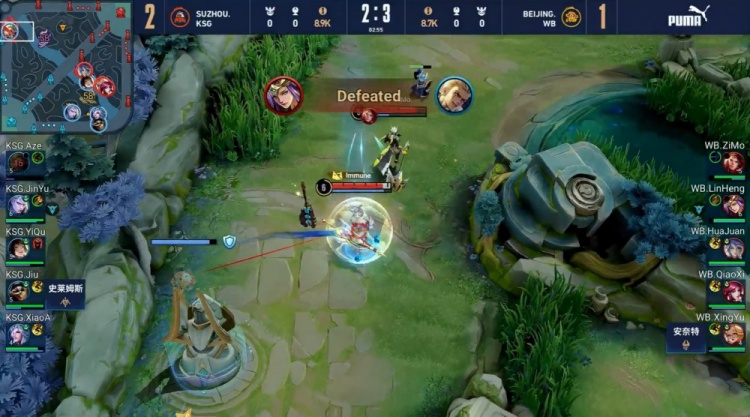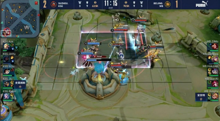 【21:56】北京WB下路推进,伽罗先将铠带走,乔兮复活起身。随后北京WB推掉苏州的三高,高地开团,北京WB只点基地,苏州KSG基地爆炸,双方大比分战平。