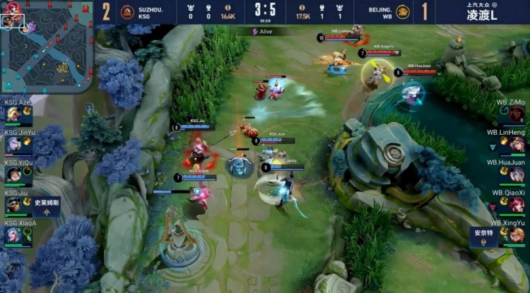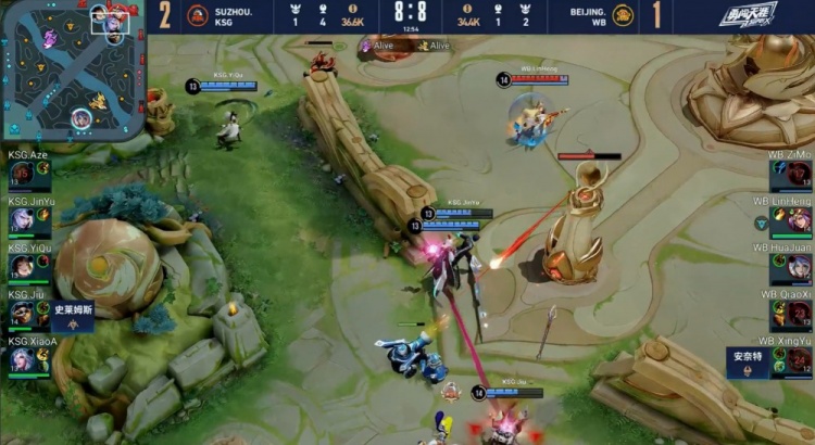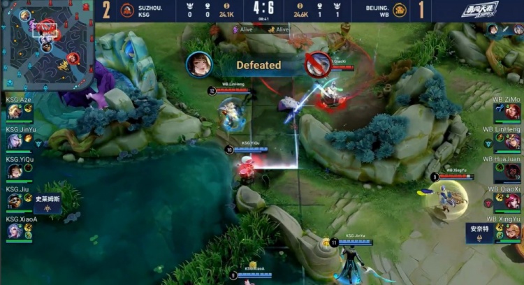 【16:32】苏州KSG中路推进,伽罗反手带走铠,史莱姆斯无敌输出击杀雅典娜,苏州KSG不断拉扯,伽罗反手双杀,上官婉儿送伽罗三杀,北京WB打出2换4守住基地,双方经济差距回到2k。