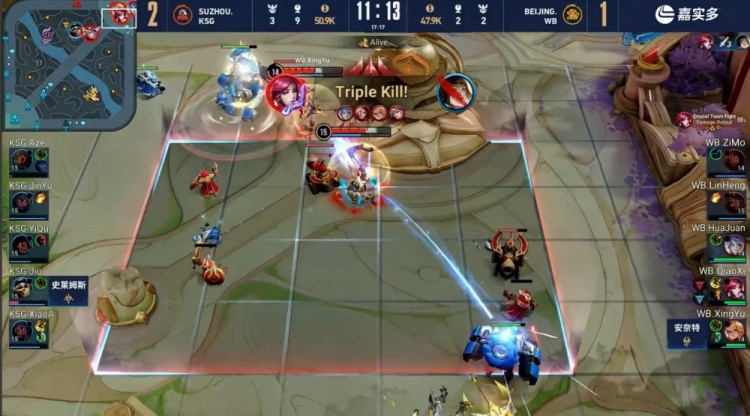 【11:27】双方暴君面前拉扯,孙策被抓开船逃生,北京WB去开暴君。随后双方中路开团,史莱姆斯带走伽罗拿到双杀,安奈特送史莱姆斯三连决胜,苏州KSG打出1换3推掉北京WB中上高地塔,经济领先3k。