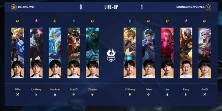 红色方重庆狼队:归期亚连、小胖夏侯惇、向鱼伊格、妖刀狄仁杰、一笙孙膑