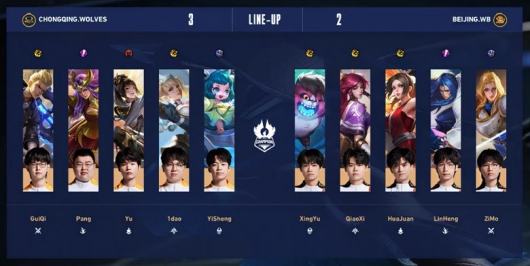 蓝色方重庆狼队:归期狂铁、小胖雅典娜、向鱼上官婉儿、妖刀卡芬妮、一笙蔡文姬