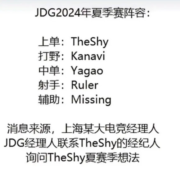 JDG夏季赛阵容:TheShy、Kanavi、Yagao、Ruler、MISSING