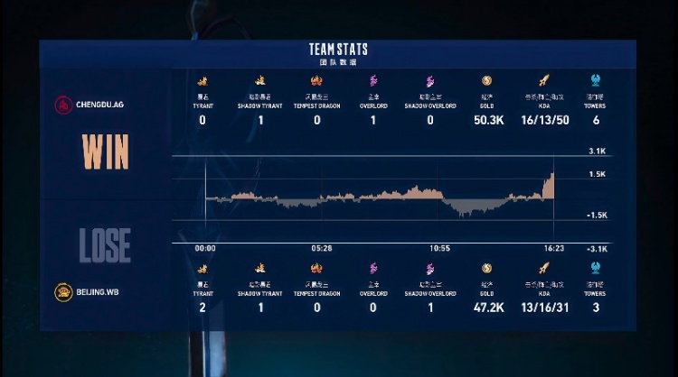 【16:10】双方在龙坑处爆发团战,一诺老夫子在被击杀前关键技能捆到李元芳,WB团战失去关键输出,AG打赢团战拿下比赛胜利!