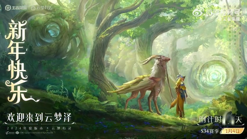 直播吧1月1日讯 王者荣耀官博更新,宣布2024年度版本「云梦有灵」将于1月4日重磅开启,新赛季共赴云梦泽!