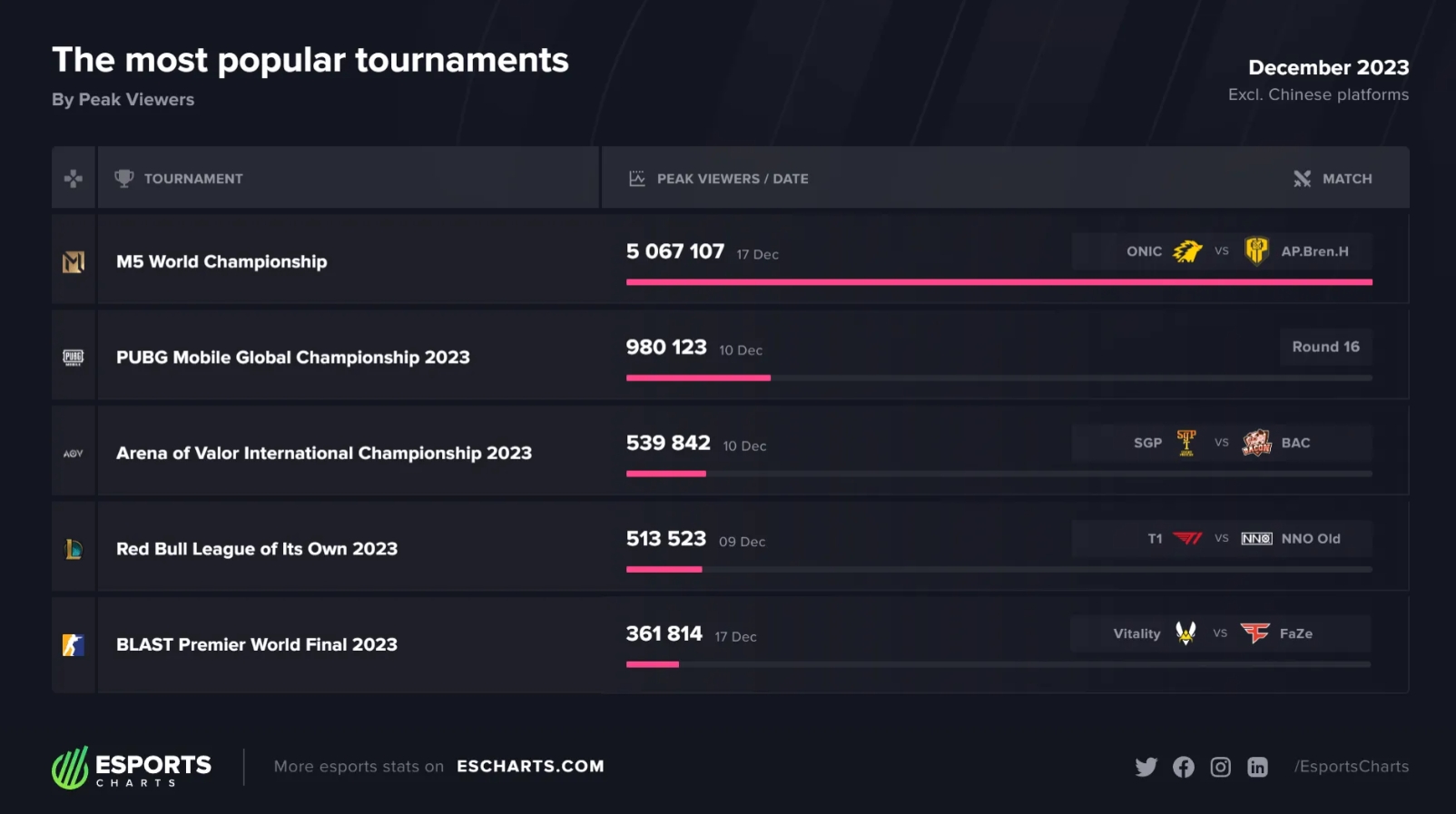 直播吧1月5日讯 国外数据统计网站Esports Charts统计了2023年12月各电竞赛事观众峰值排名,最终排名前五的电竞赛事如下: