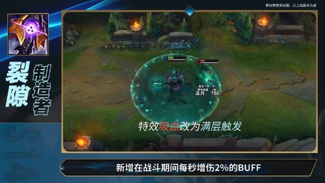 峡谷制造者更名为裂隙制造者,获得全新的装备被动,移除常驻的全能吸血,改为战斗期间每秒获得2%的增伤BUFF,叠满被动层数后获得全能吸血。