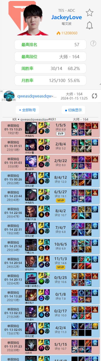 直播吧1月15日讯 根据韩服排位统计小程序显示,TES下路选手JackeyLove在韩服排位豪取十连胜,但随后遭遇三连败,目前大师164点。