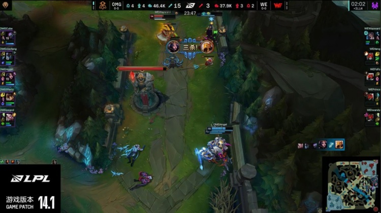 【19:20】WE野辅下路三角草又被OMG众人逮捕,蔚先行阵亡,烈娜塔被追至自家野区殒命,OMG打出0换2经济领先4k。
