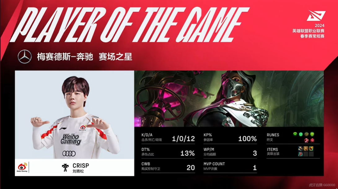 直播吧1月25日讯 今日LPL春季赛WBG成功横扫RA,而在本场比赛的第二局游戏中Crisp操刀自己绝活的烈娜塔多次打出关键大招,收获了本局比赛的MVP。