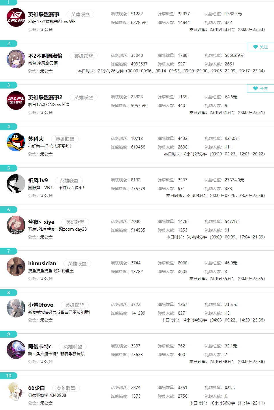 其中英雄联盟区里活跃观众排名第一的是【英雄联盟赛事】官方直播间,第二位的是【周淑怡】,排在第三的是【英雄联盟赛事】副舞台,具体排名如下: