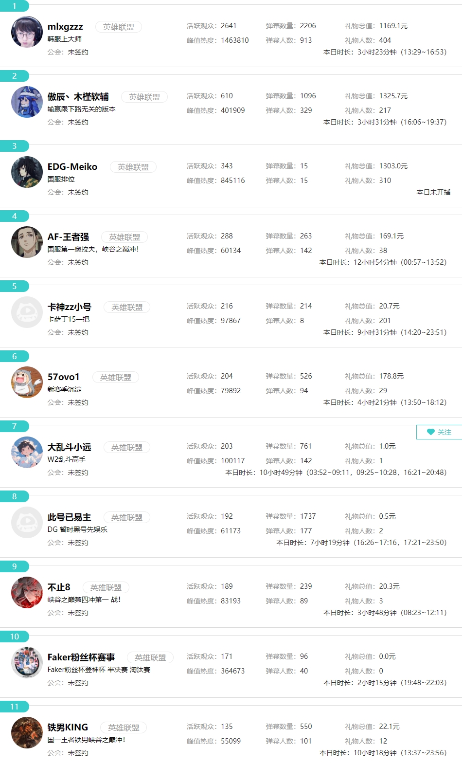 在英雄联盟区里,活跃观众数排名第一的【MLXG】,【Meiko】在未开播的情况下排在第三位,具体数据如下: