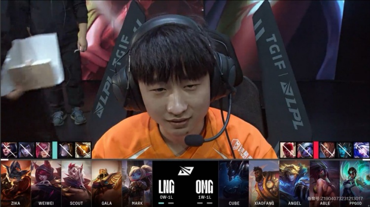 红色方OMG:Cube奎桑提、Xiaofang梦魇、Angel阿卡丽、Able伊泽瑞尔、ppgod卡尔玛