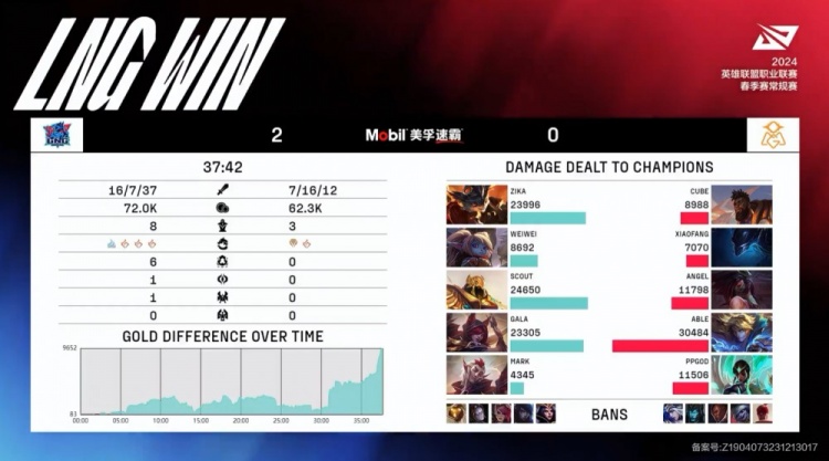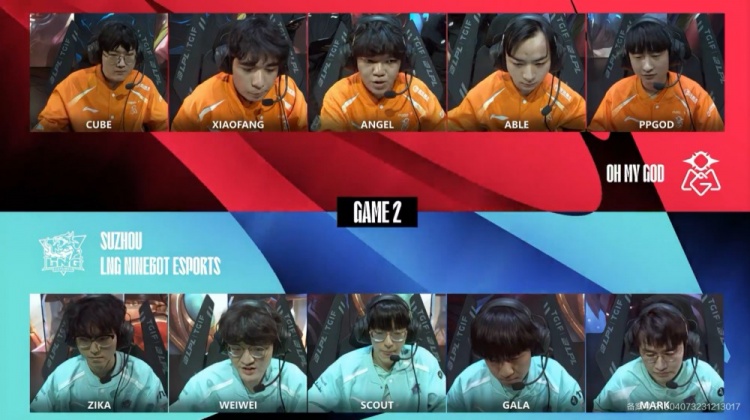 第二局Able替补登场使用伊泽瑞尔。前期Weiwei三路gank为LNG打开局面。中期LNG中路放出先锋连推OMG两座外塔后听牌火龙魂,眼看形势一片大好,Cube野区爆炸果实弹在Angel脸上被其单杀。中路双方拉扯,Able精准弹幕收掉Scout,OMG经济劣势回到1k。后期LNG强吃大龙得手并打出0换2,再次将经济优势扩大到4k。最终LNG收掉火龙魂,中路一波推上OMG将其击溃,拆掉基地拿到比赛胜利。