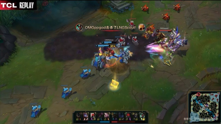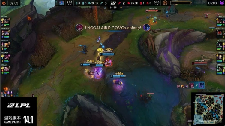 【14:49】上路开团,NOC关灯飞进人群但是被洛抬起留下,霞跟上输出收掉人头,LNG推掉OMG上路一塔。